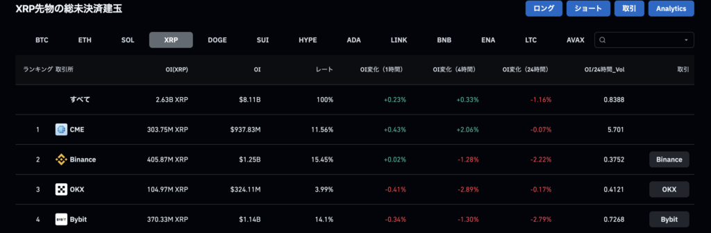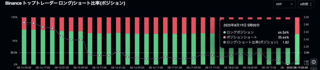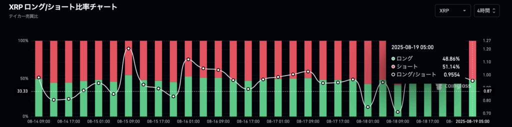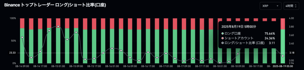 XRPは全体的に落ち着いた推移を見せており、未決済建玉(OI)は小幅な増減に留まっています。CoinGlassのデータでは全体のロング・ショート比率が拮抗しており、ややショート優勢の状況です。一方、Binanceのトップトレーダーは口座・ポジションともにロング比率が高く、強気スタンスが目立ちます。