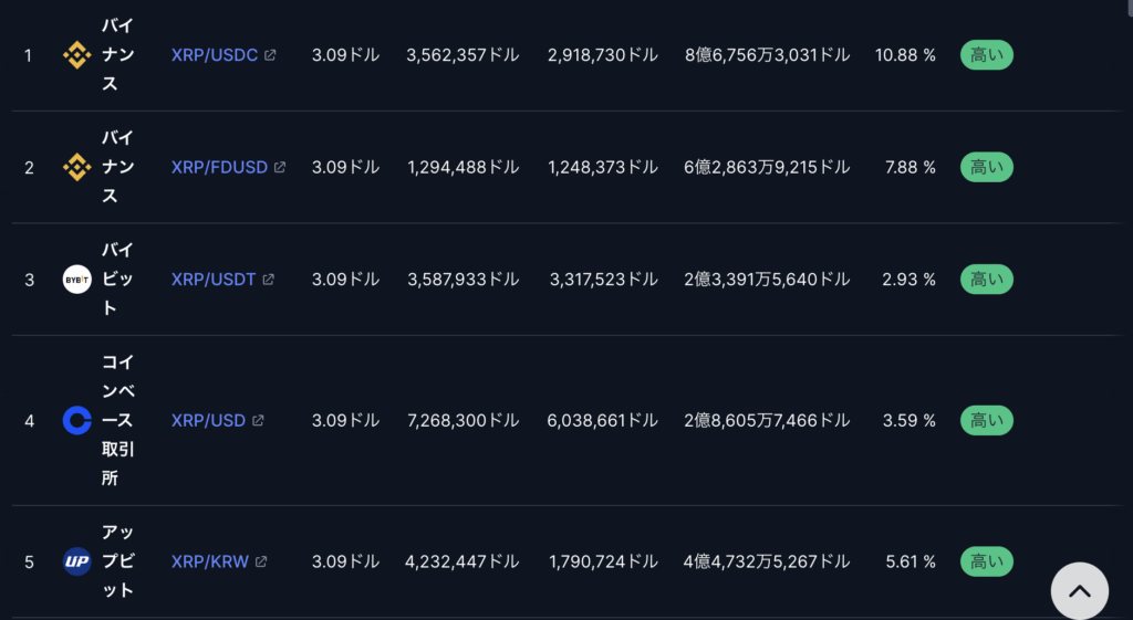 1位:Binance(XRP/USDC)