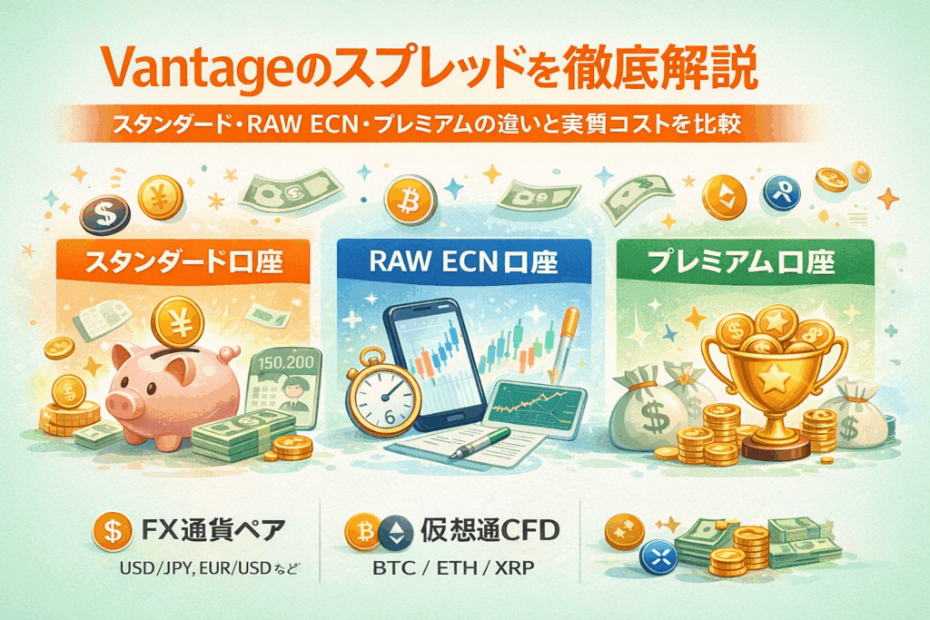 本記事では、VantageのスタンダードSTP口座、RAW ECN口座、プレミアム口座それぞれのスプレッド構造を整理し、